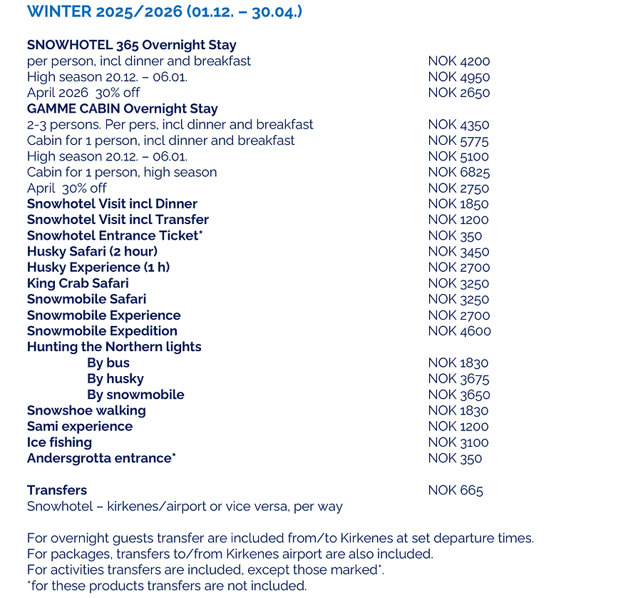 Inngang til Snowhotel inkludert. For overnatting og aktiviteter i forbindelse med konferanse/arrangement, se prisoversikt over.